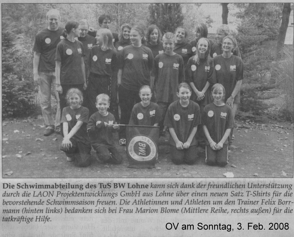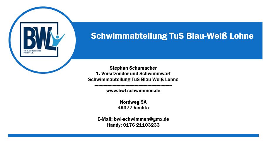 Die Schwimmabteilung des TuS Blau-Weiß Lohne bietet Schwimmkurse für Kinder und Jugendliche vom Anfängerschwimmen (Seepferdchen bzw. Freischwimmer) bis zum Wettkampfschwimmen an. Kurse zur Wassergewöhnung zum Erlangen der Schwimmfähigkeit können wir leider nicht anbieten.Neben den Kinderschwimmen bieten wir auch freie Schwimmzeiten für Erwachsene (Masters).