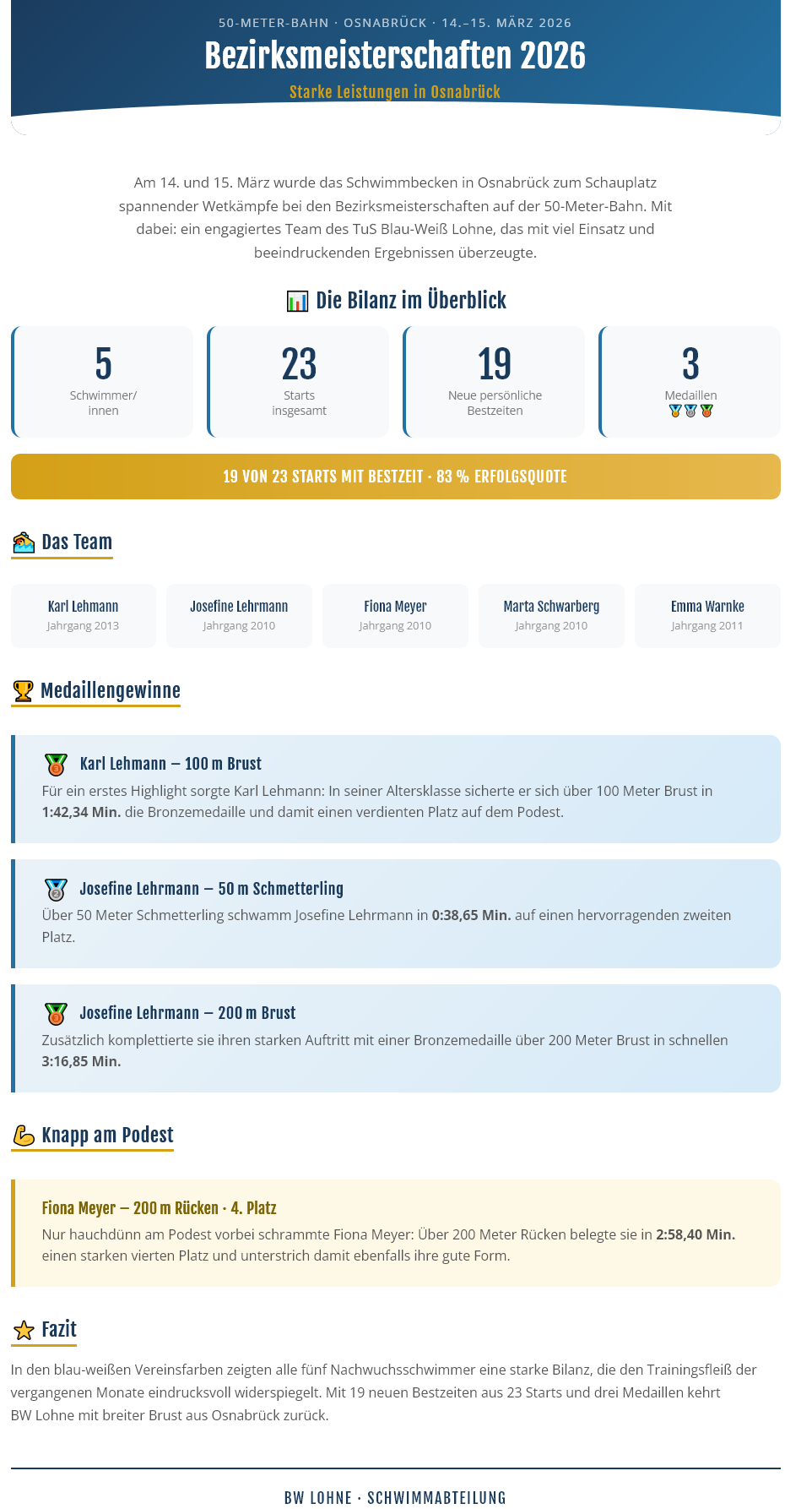 Zum 51. Artland-Schwimmfest war die Schwimmabteilung von Blau-Weiß Lohne mit 25 Aktiven am Start und auch drei Kampfrichtern.