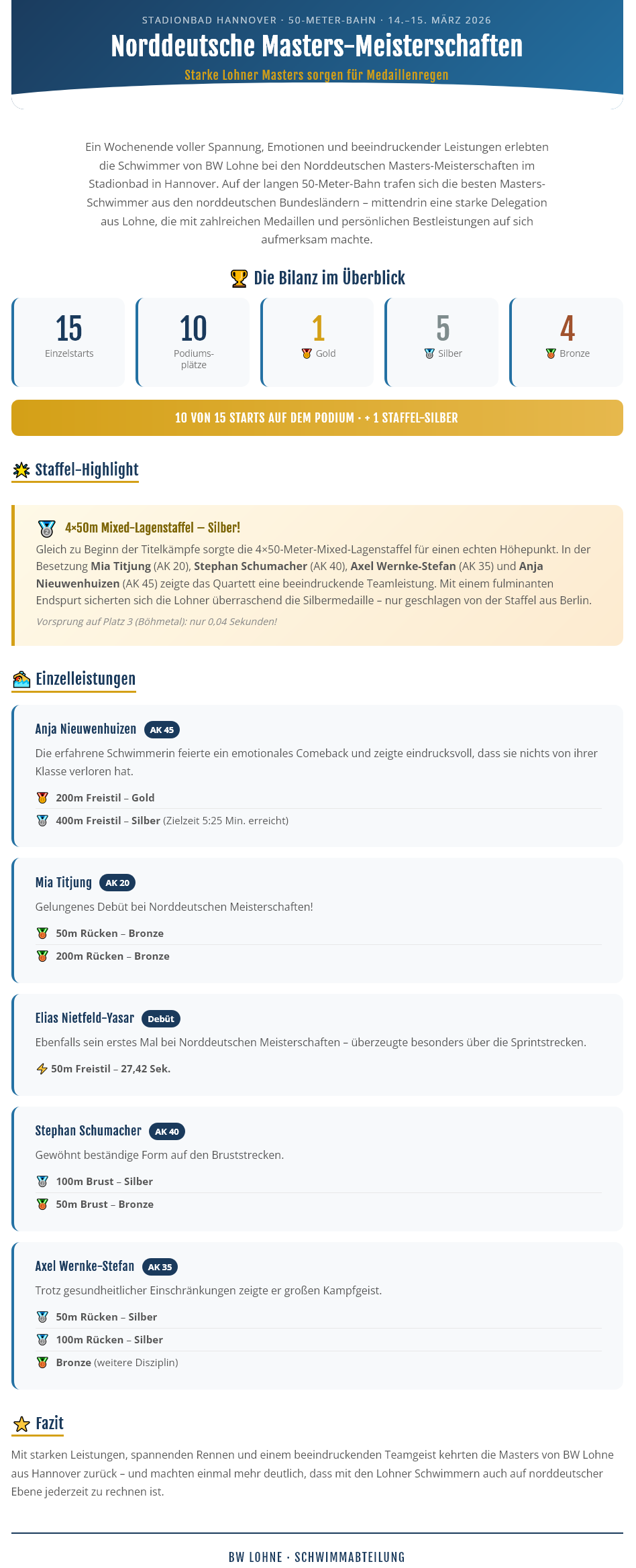 Neben den großen Schlaglichtern zeigten auch die weiteren Schwimmerinnen und Schwimmer der Lohner Mannschaft starke Leistungen. Axel freute sich über 400m Lagen in 5:04,31 Minuten über einen neuen Vereinsrekord. Auch die erfahrenen und jungen Teammitglieder - Elias, Stephan, Fiona, Greta und Mia - trugen mit beherzten und starken Auftritten zum perfekten Saisoneinstieg bei.